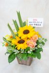 夏を呼ぶ花ひまわりを中心に、オレンジバラと黄色グリーンでまとめました。入才(ニューサイ)という葉をザク切りにしてアクセントに。お洒落で落ち着いたデザインは、夏の贈り物に一押しの作品です。